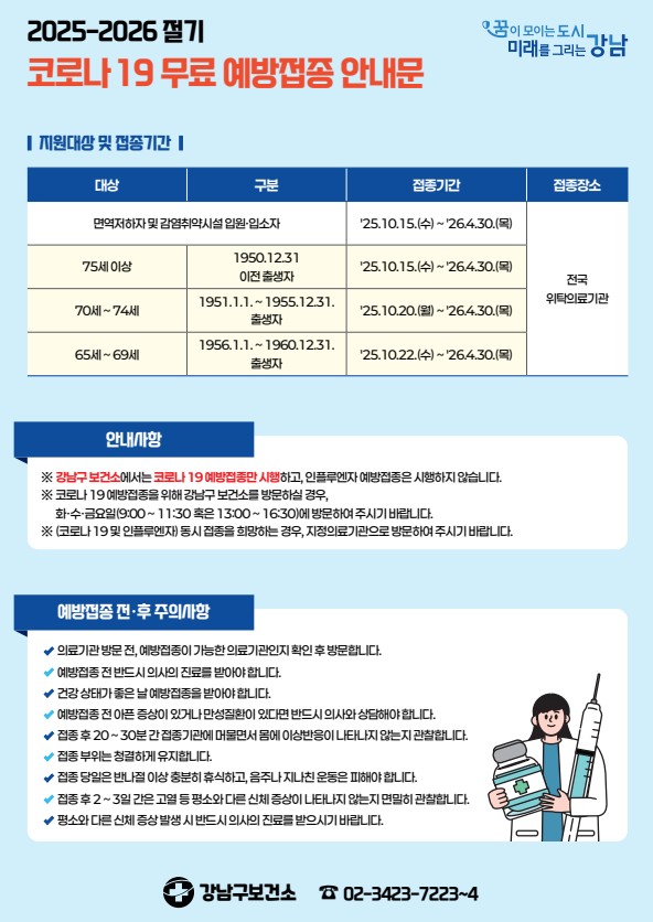 올해도 강남구는 어르신, 어린이, 임산부, 의료취약계층을 위해 독감(인플루엔자) 및 코로나19 무료 예방접종을 시행합니다.
