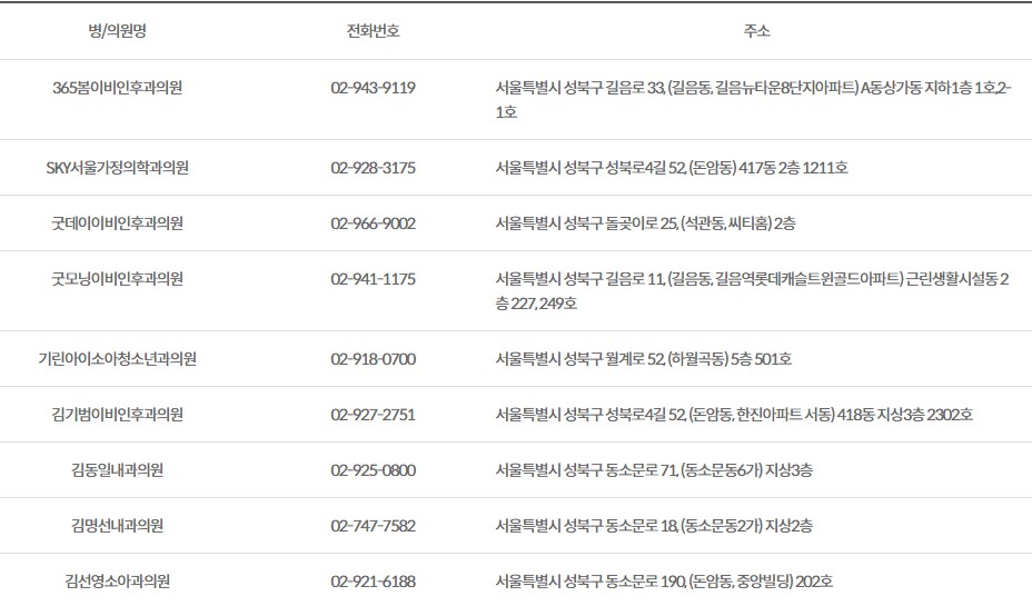 소아과·내과·가정의학과 중심으로 고르게 배치되어 있어 접근성이 뛰어나고, 특히 정릉·길음·돈암·장위·월곡 등 주요 동별로 고르게 분포해 있어 편리합니다.