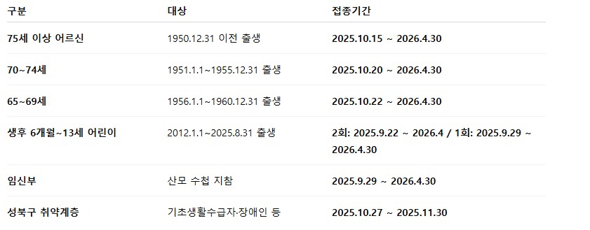 성북구에서도 2025-2026절기 인플루엔자(독감) 무료 예방접종이 시작되는데요, 연령별·대상별 접종 시작일이 다르고, 성북구 취약계층은 반드시 성북구 지정 병의원에서만 접종 가능하기 때문에 꼭 체크해야 합니다.